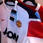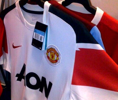 The new 2010-11 Man Utd away kit is manufactured by Nike logo on the right chest and the badge on left. The away shirt is white with red and black patches on the shoulders.